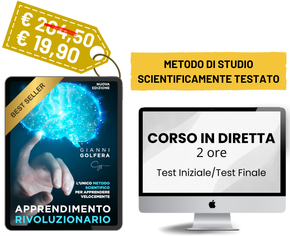 Bonus esclusivo: Corso online di 2 ore in cui il Prof. Gianni Golfera ti guida passo dopo passo a evitare gli errori che commetti quando studi e ad acquisire un metodo pratico e scientificamente testato per apprendere e ricordare tutto quello che ti serve.